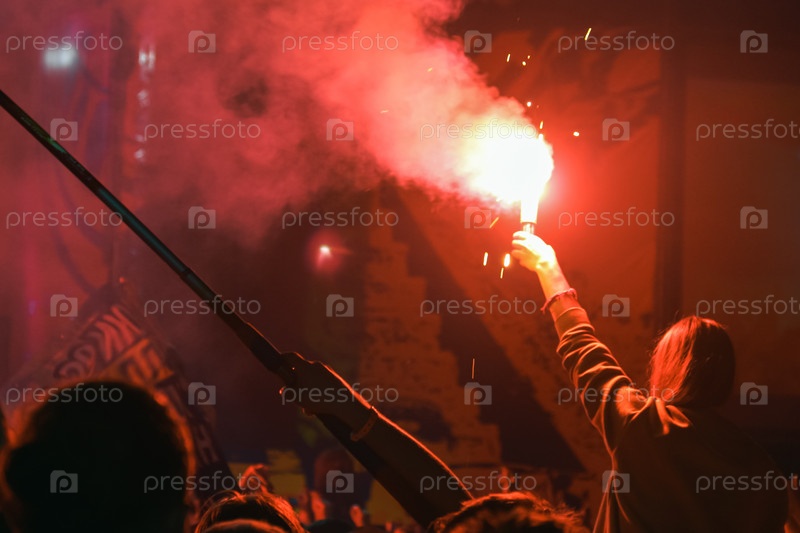 Девушка с красным факелом в руке перед сценой на музыкальном рок-фестивале. Толпа фанатов на концерте