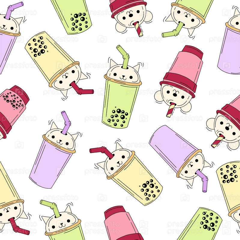 Бесшовный рисунок чашек для напитков. Чай, безалкогольные напитки в пластиковых стаканчиках, модный десерт, красочная векторная коллекция