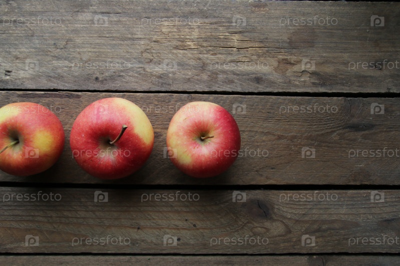 Спелые сочные яблоки на деревянном фоне