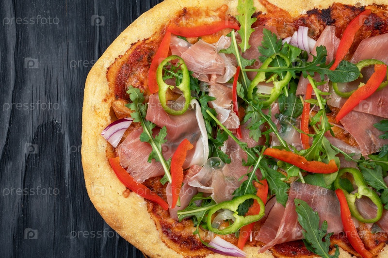 Итальянская пицца на тарелке с ломтиками хамона, перцем и свежими листьями рукколы сверху
