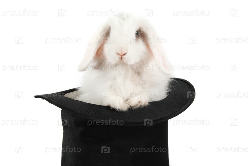 Маленький кролик в черной шляпе, изолированные на белом фоне