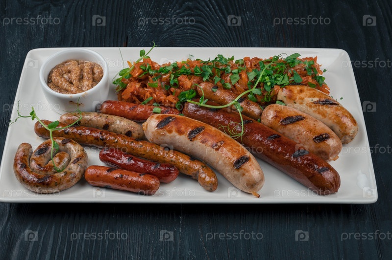 Жареные разные колбаски с добавлением трав и соуса из хрена на тарелке. Еда на гриле, барбекю, концепция барбекю