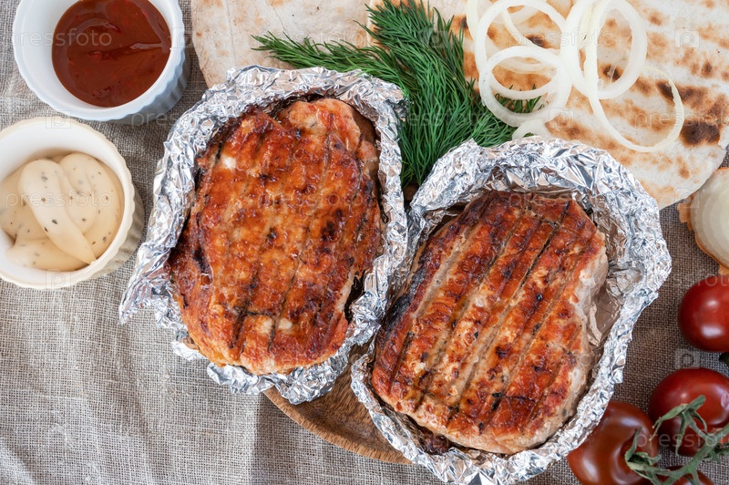 Свинина на гриле в фольге с оладьями и овощами