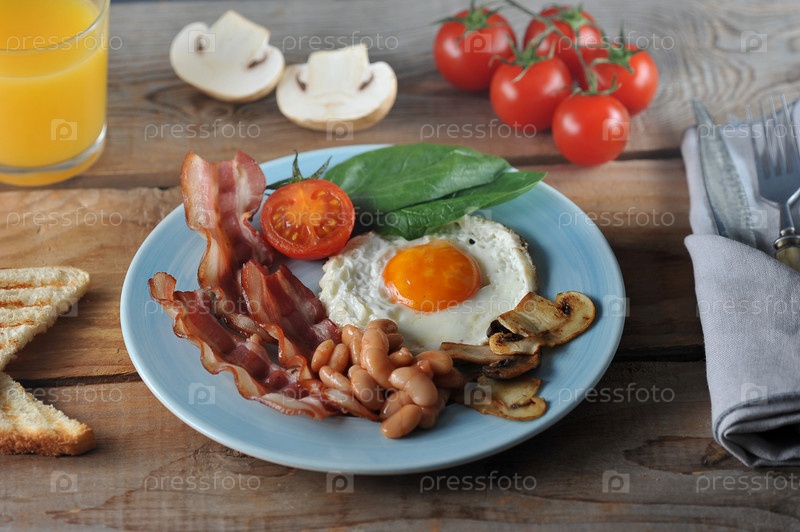 Завтрак из яиц с беконом, фасолью, грибами, помидорами и шпинатом