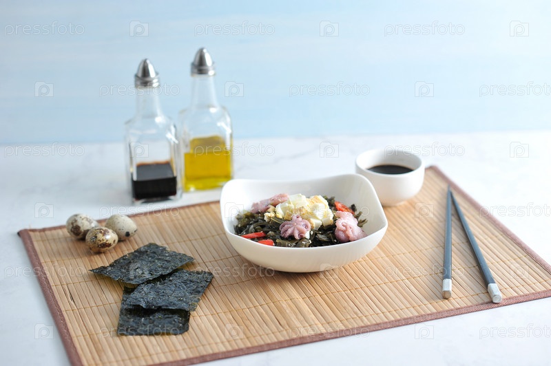 Салат из морской капусты, осьминога, яиц и лука