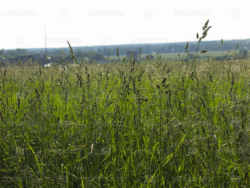 Высокая трава в поле с колосками в ясный солнечный летний день