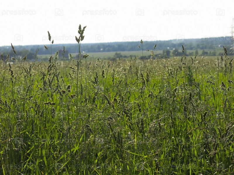 Высокая трава в поле с колосками в ясный солнечный летний день