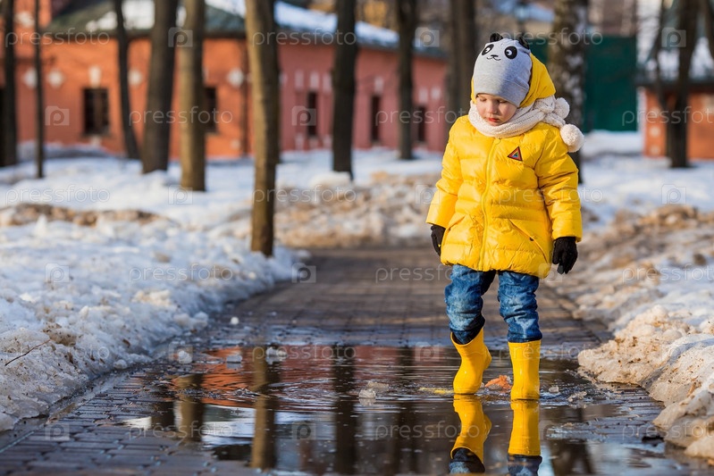 Портрет маленького ребенка 4 лет в желтых резиновых сапогах и куртке. Малыш гуляет в парке весной. Фото весенних и осенних праздников