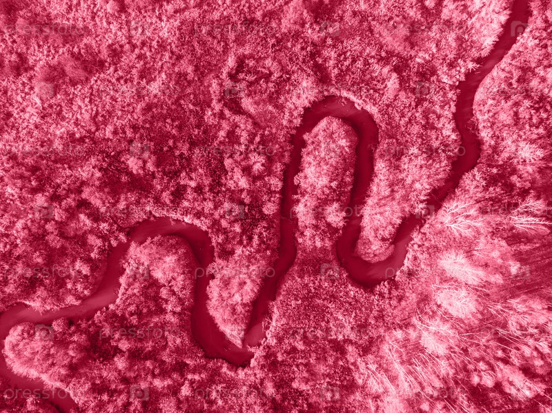 Модный цвет 2023 года: Viva Magenta в тонах. вид с воздуха на осенний пейзаж с рекой