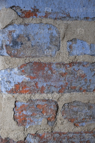 Текстура старой краски голубого цвета на кирпичах со следами цементной кладки