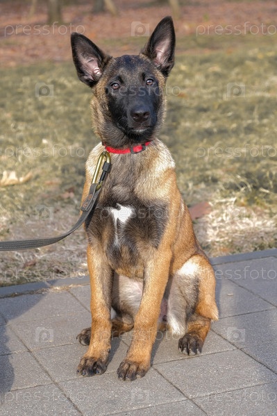 Портрет сидячего щенка малинуа палевого окраса на фоне травы