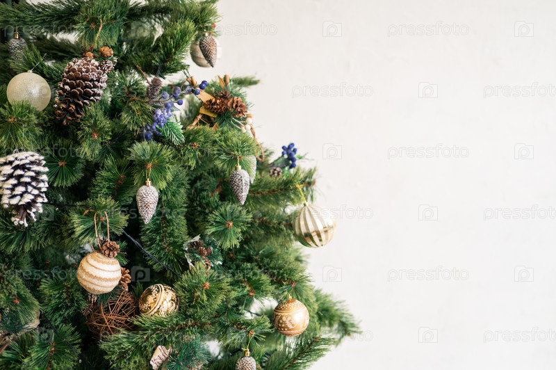 Елочная ветка, украшенная шарами красоты и другими елочными украшениями