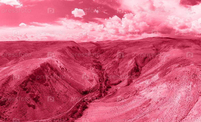 Цвет 2023 года: Viva Magenta в тонах, вид с дрона на эрозию рельефа