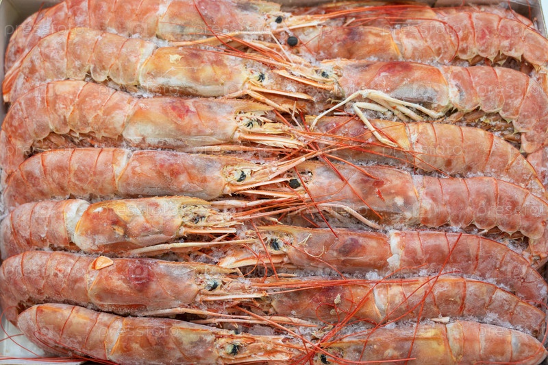 Замороженные креветки в холодильнике на рыбном рынке. Концепция здорового питания и рыбного рынка