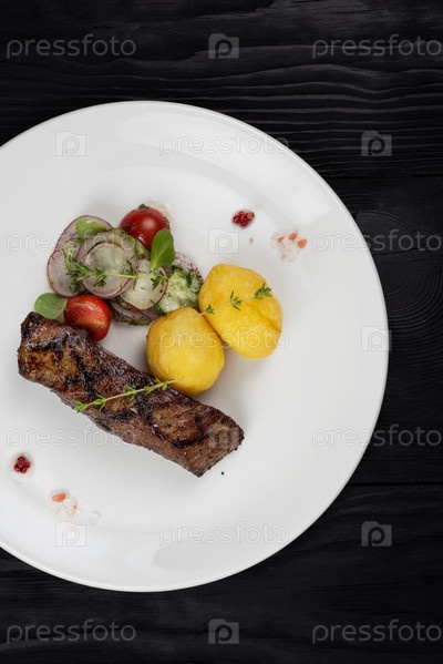 Стейк из говяжьей юбки на гриле с картофелем и овощами на белой тарелке на деревянном черном фоне