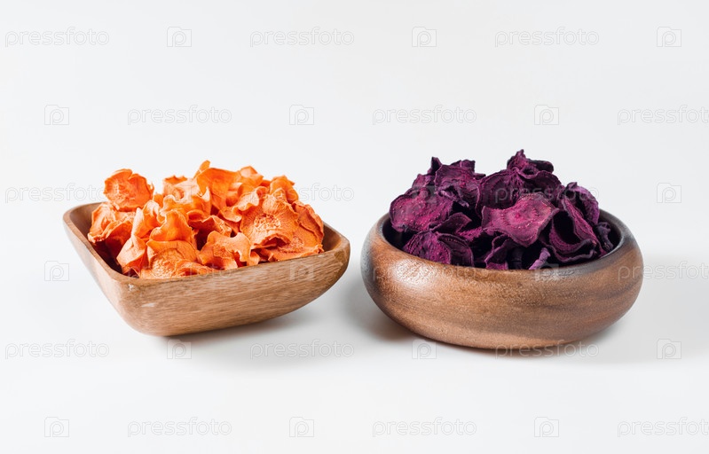 Сушеные чипсы из моркови и свеклы в деревянной миске на белом фоне. Вегетарианская диетическая еда. Горизонтальная ориентация