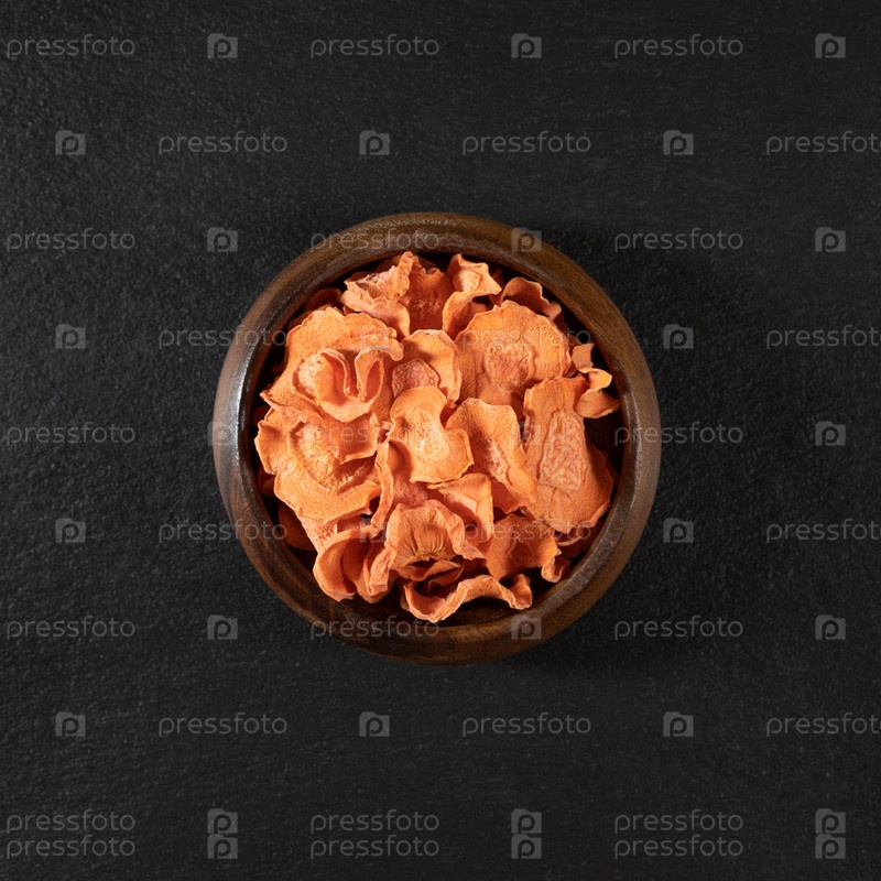 Сушеные морковные чипсы в деревянной миске на фоне черного камня. Органическая натуральная пища