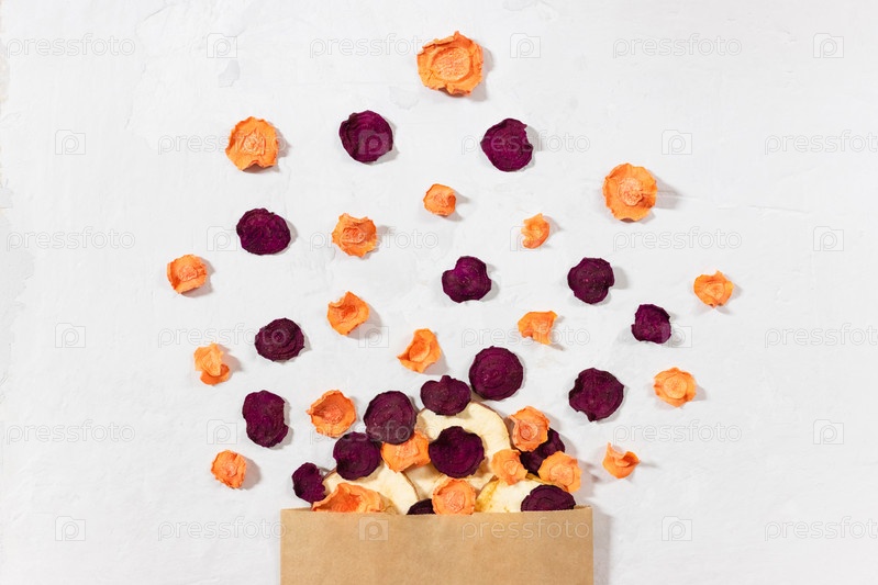 Сушеная морковь, свекла, яблочные чипсы в бумажном пакете на белом бетонном фоне. Органическая натуральная пища