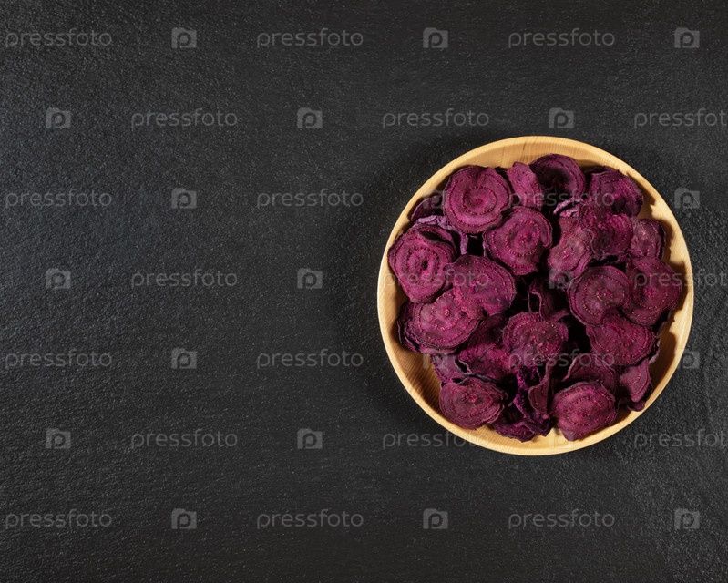 Сушеные свекольные чипсы в деревянной миске на фоне черного камня. Органическая натуральная пища