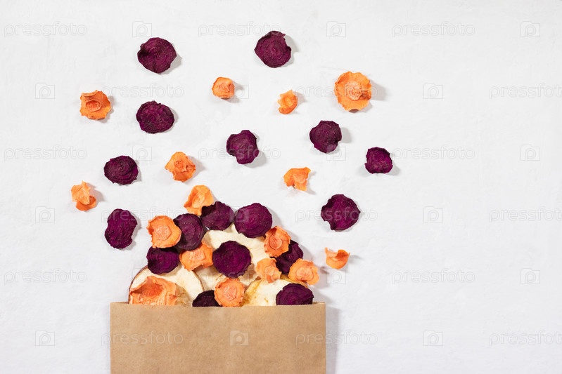Сушеная морковь, свекла, яблочные чипсы в бумажном пакете на белом бетонном фоне