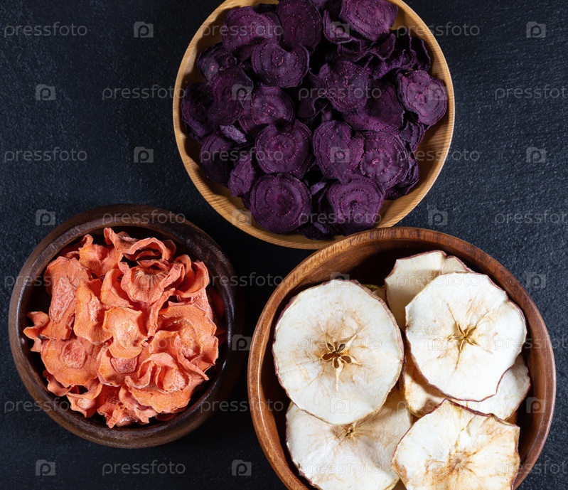 Сушеная морковь, свекла и яблочные чипсы в деревянной миске на фоне черного камня. Органическая натуральная пища