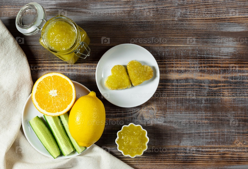 Домашнее варенье из огурцов с лимоном и тостами в форме сердца на темно-коричневом деревянном фоне