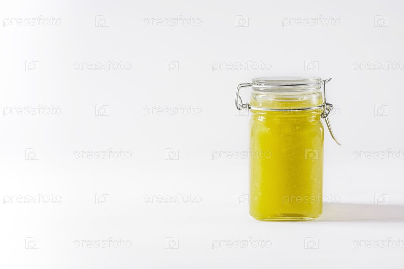 Домашнее вкусное зеленое варенье в стеклянной банке на белом фоне. Скопируйте пространство