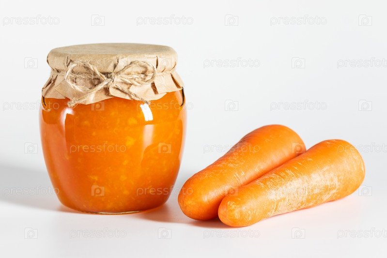 Сочное домашнее морковное варенье в стеклянных банках на белом фоне