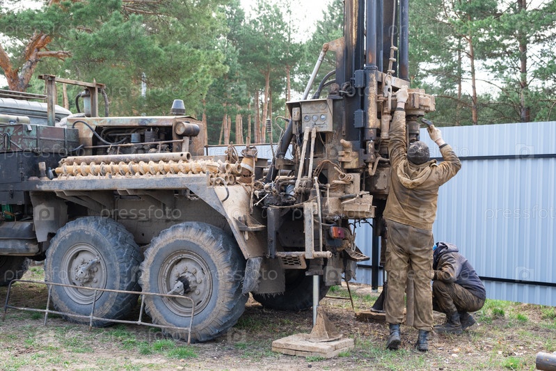 Бригада рабочих с буровой установкой на машине бурит артезианскую скважину для воды в земле. Закладка металлической обсадной трубы в землю, установка индивидуального питьевого водоснабжения, 28 июня 2022, Россия,