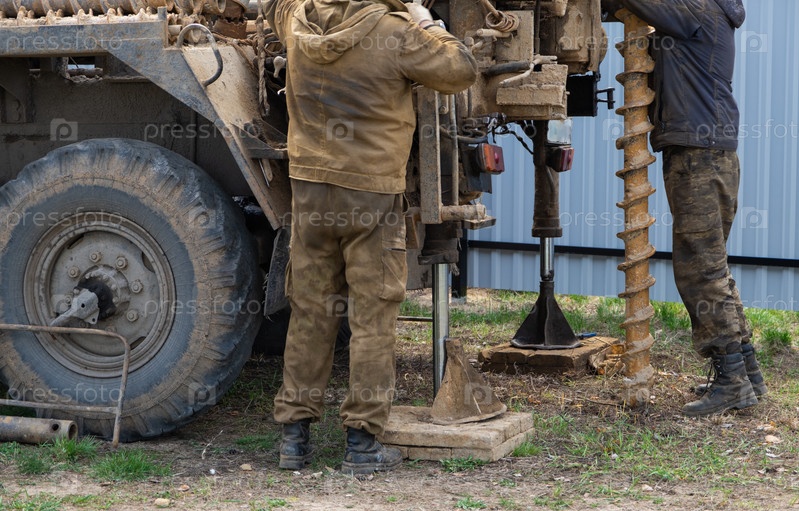 Бригада рабочих с буровой установкой на машине бурит артезианскую скважину для воды в земле. Закладка металлической обсадной трубы в землю, установка индивидуального питьевого водоснабжения, 28 июня 2022, Россия,