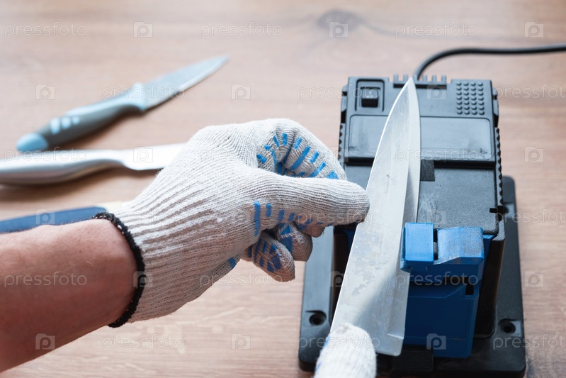 Заточка ножа на электроточилке в домашних условиях. Мужская рука загоняет лезвие ножа между синими точилками, на станок летит пыль