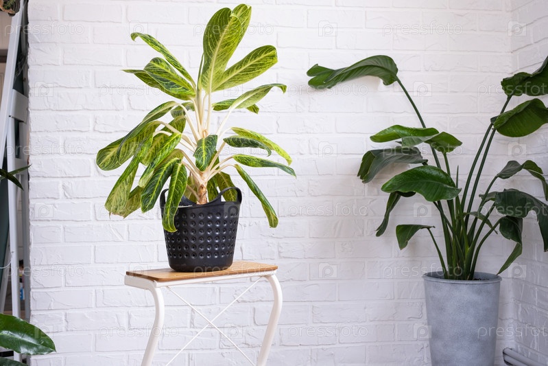 Крупный план аглаонемы в интерьере на столе. Комнатное растение Выращивание и уход за комнатным растением, зеленый дом
