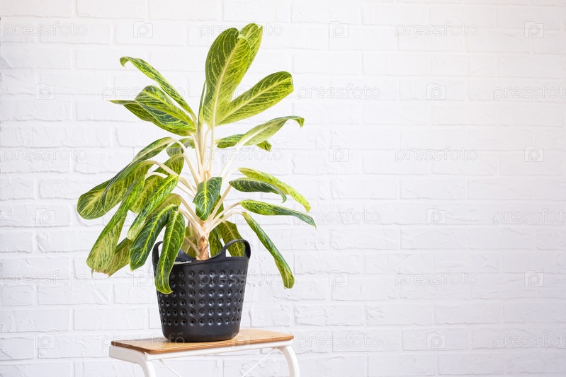 Крупный план аглаонемы в интерьере на столе. Комнатное растение Выращивание и уход за комнатным растением, зеленый дом