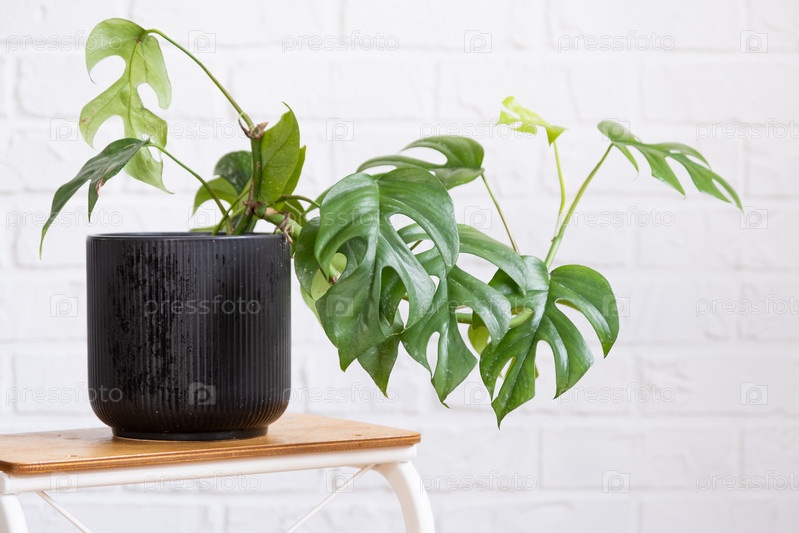 Лист крупного плана Monstera Minima Rhaphidophora TETRASPERMA в интерьере на белой кирпичной стене. комнатные растения в горшках, зеленый домашний декор, уход и выращивание