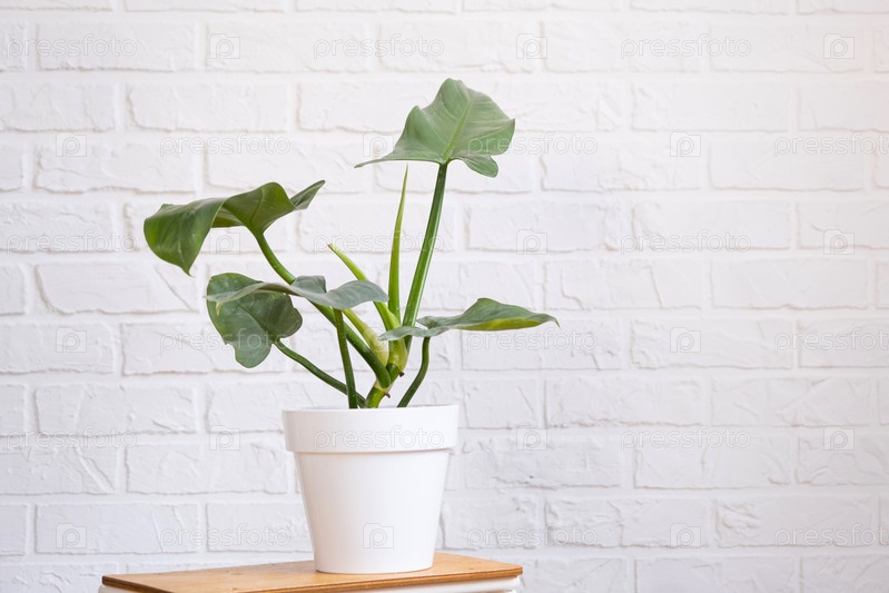 Ростки для выращивания популярного филодендрона ароидного растения в горшке на подставке в интерьере на белой кирпичной стене. Комнатные растения в горшках, зеленый домашний декор, уход и выращивание