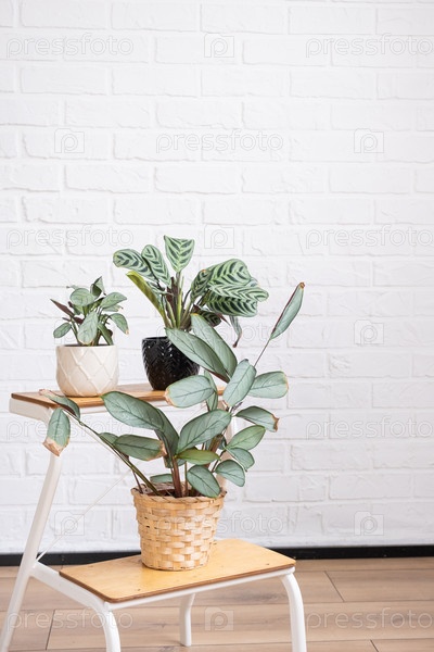 Ctenanthe Burle-Marxii Amagris в интерьере на белой кирпичной стене. Marantaceae Комнатные растения в горшках, зеленый домашний декор, уход и выращивание