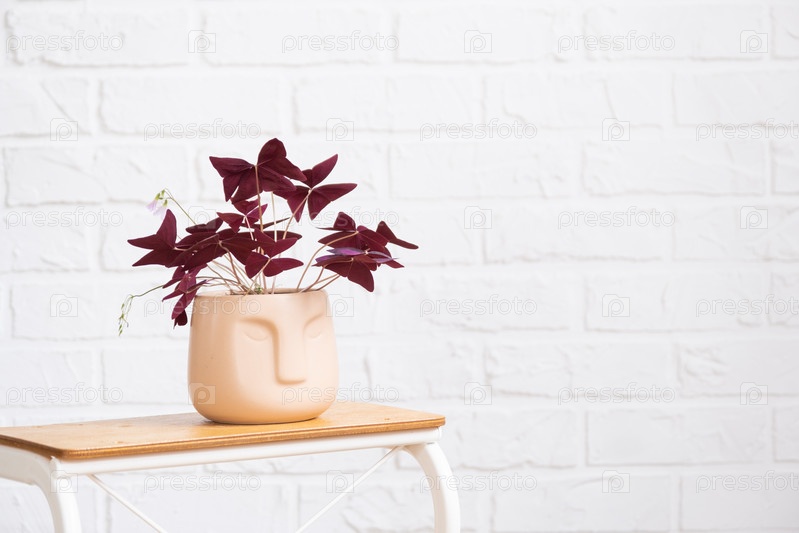 Кислица красная в горшке с лицом с листьями бабочки на подставке в интерьере на белой кирпичной стене. Комнатные растения в горшках, зеленый домашний декор, уход и выращивание