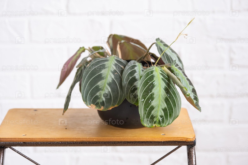 Редкий сорт комнатных растений Maranta leuconeura Massangeana крупный план лист в интерьере на белой кирпичной стене. комнатные растения в горшках, зеленый домашний декор, уход и выращивание