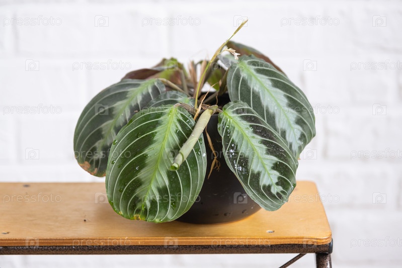 Редкий сорт комнатных растений Maranta leuconeura Massangeana крупный план лист в интерьере на белой кирпичной стене. комнатные растения в горшках, зеленый домашний декор, уход и выращивание