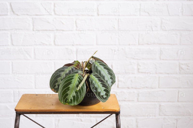 Редкий сорт комнатных растений Maranta leuconeura Massangeana крупный план лист в интерьере на белой кирпичной стене. комнатные растения в горшках, зеленый домашний декор, уход и выращивание