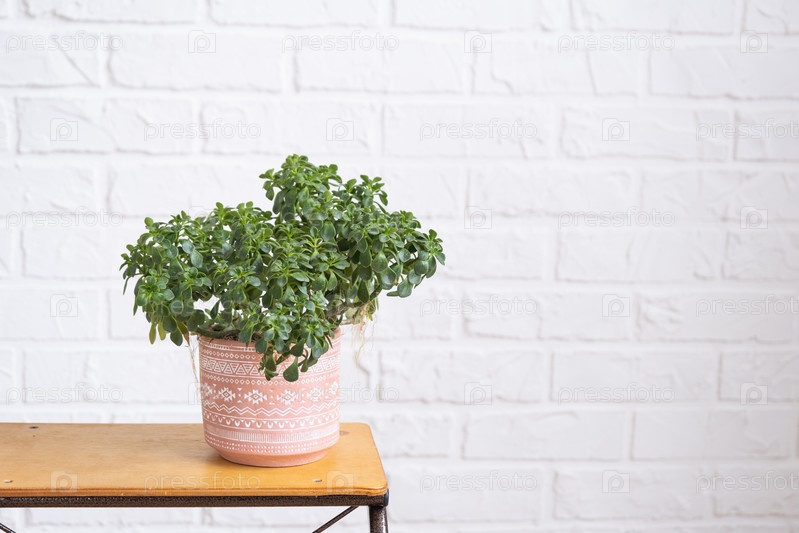 Aichryson дерево любви крупный план в интерьере на белой кирпичной стене. комнатные растения в горшках, зеленый домашний декор, уход и выращивание