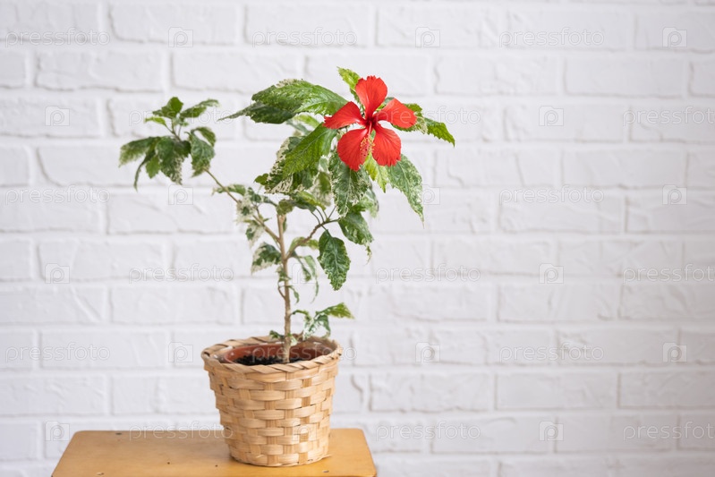 Красный сортовой цветок гибискуса с пестрыми листьями в плетеной кашпо в интерьере на фоне белой кирпичной стены. Выращивание комнатных растений в горшке в зеленом доме
