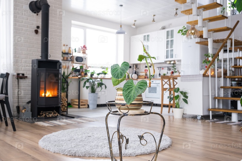 Крупный план Philodendron verrucosum в интерьере на подставке. комнатное растение Выращивание и уход за комнатным растением, зеленый дом в скандинавском стиле лофт с металлической печью камином с горячим огней