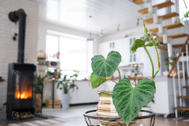Крупный план Philodendron verrucosum в интерьере на подставке. комнатное растение Выращивание и уход за комнатным растением, зеленый дом в скандинавском стиле лофт с металлической печью камином с горячим огней