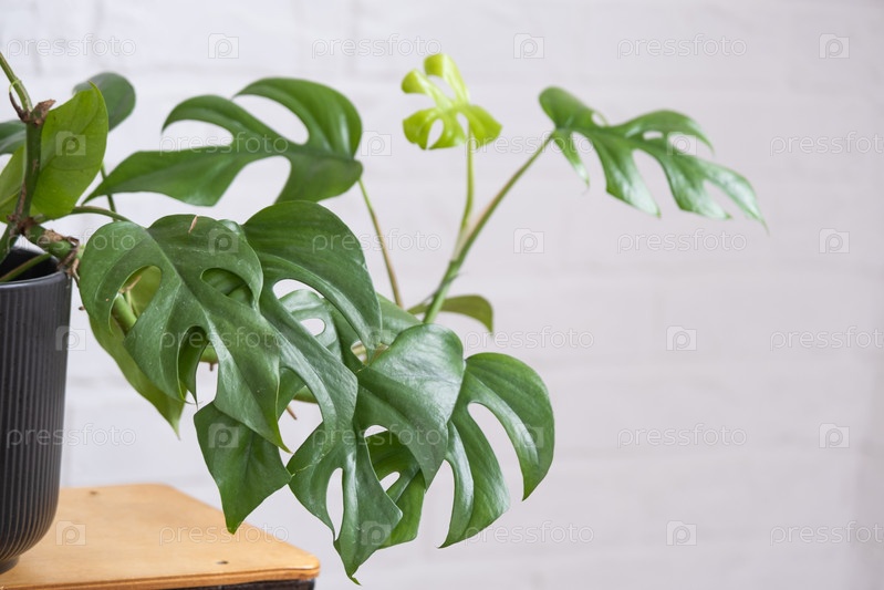 Лист крупного плана Monstera Minima Rhaphidophora TETRASPERMA в интерьере на белой кирпичной стене. комнатные растения в горшках, зеленый домашний декор, уход и выращивание