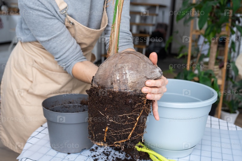 Женщина пересаживает орех кокосовой пальмы с комком земли и корнями в горшок дома в интерьере. Теплица, уход и выращивание тропических растений