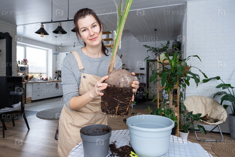 Женщина пересаживает орех кокосовой пальмы с комком земли и корнями в горшок дома в интерьере. Теплица, уход и выращивание тропических растений