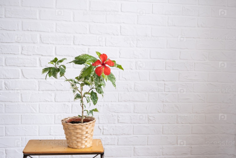 Красный сортовой цветок гибискуса с пестрыми листьями в плетеной кашпо в интерьере на фоне белой кирпичной стены. Выращивание комнатных растений в горшке в зеленом доме