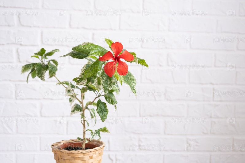 Красный сортовой цветок гибискуса с пестрыми листьями в плетеной кашпо в интерьере на фоне белой кирпичной стены. Выращивание комнатных растений в горшке в зеленом доме