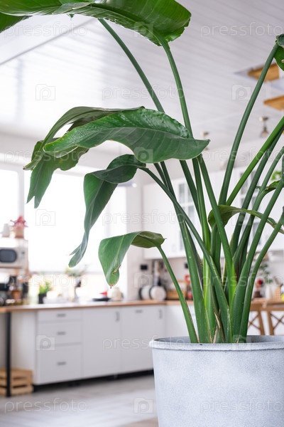 Крупный план Strelitzia nicolai в интерьере на стенде. комнатное растение Выращивание и уход за комнатным растением, зеленый дом в скандинавском стиле лофт с металлической печью камином с горячим огней